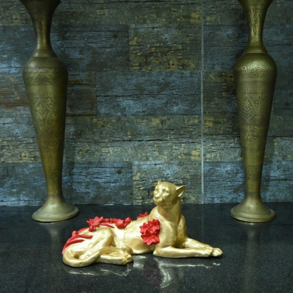Buy now and enrich your home decor with this stunning gold Cheetah statue, beautifully adorned with vibrant red flowers. This exquisite piece captures the elegance and charm of feline grace, making it a perfect addition to any room. Crafted with attention to detail, the shimmering gold finish adds a touch of luxury, while the bold red flowers bring a pop of color that brightens your space.